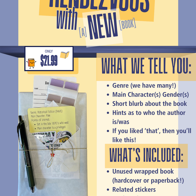 This is our take on the viral sensation "Blind Date with a Book" ~ Choose which book's blurb interests you most in-store, or purchase online for dealer's choice!