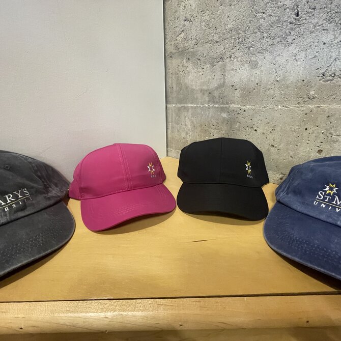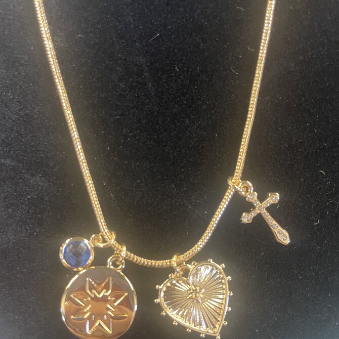 A beautiful golden necklace made in collaboration with Emerson Street Clothing Co. It features the St. Mary's star on a circular charm, a blue glass stone in the signature StMU Blue, a bedazzled cross charm, and a gorgeous heart.