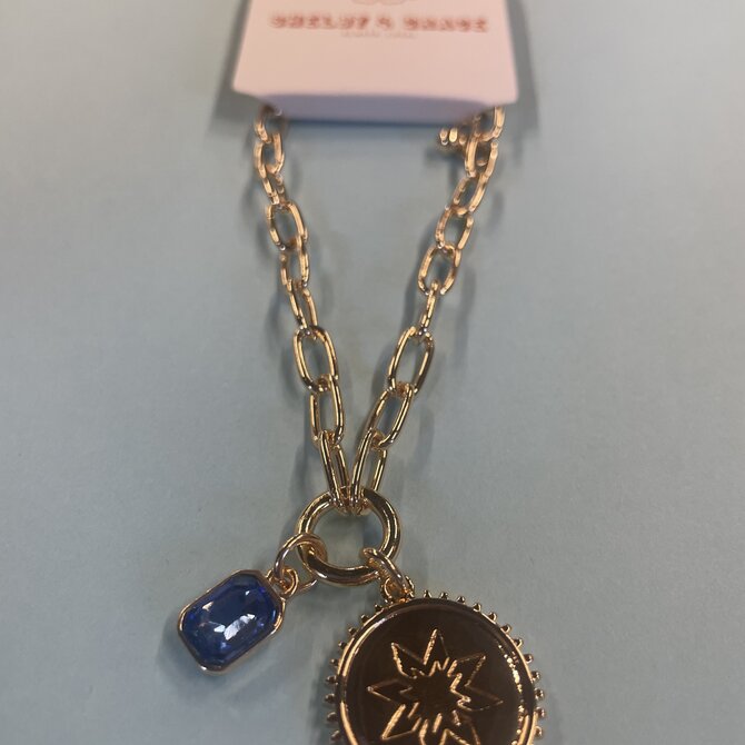 A delicate-looking golden chain bracelet with a circular St. Mary's star charm and a stunning glass stone in the signature StMU blue. This piece is part of our Shelby & Grace collaboration.