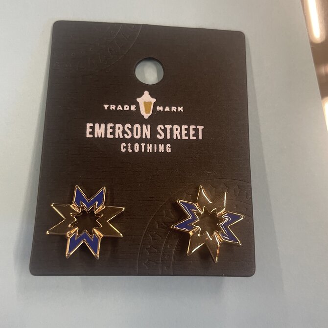 A beautiful golden necklace made in collaboration with Emerson Street Clothing Co. It features the St. Mary's star on a circular charm, a blue glass stone in the signature StMU Blue, a bedazzled cross charm, and a gorgeous heart.